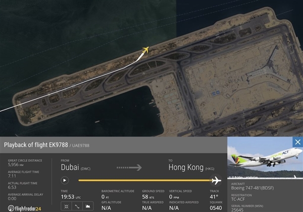 10月20日消息,据报道,今天(10月20日)凌晨3点53分,一架执飞阿联酋货运航空EK9788货运航班的AIR ACT的747-400货机从迪拜飞抵香港。