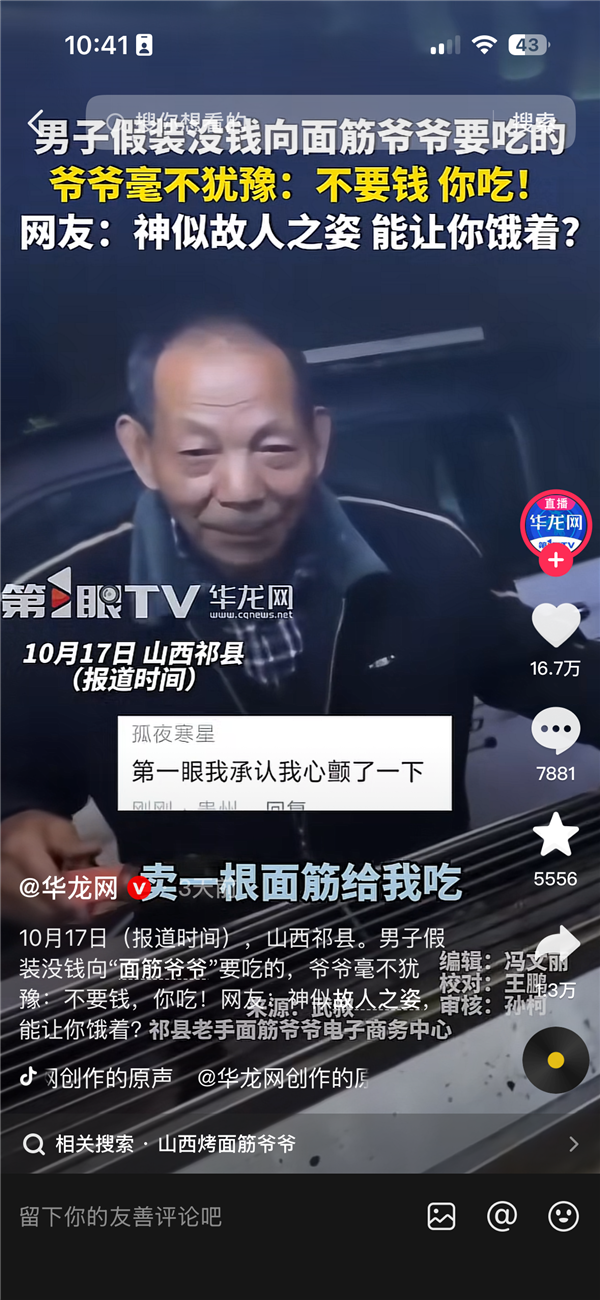10月21日消息,近日,一条“酷似袁隆平的大爷卖面筋”的视频在社交平台走红,温暖情节引发众多网友共鸣。