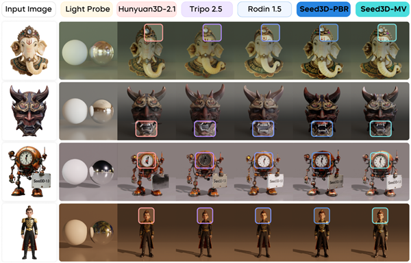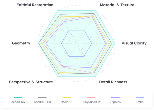 根据实测,Seed3D 1.0几何生成参数更少,效果更优;纹理材质生成的图像保持性领先。