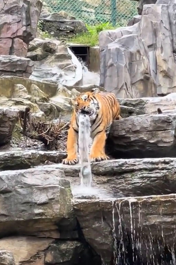 当时一只东北虎咬住水管静止不动,水流从其口中倾泻而下,被网友调侃为 “虎口瀑布”。