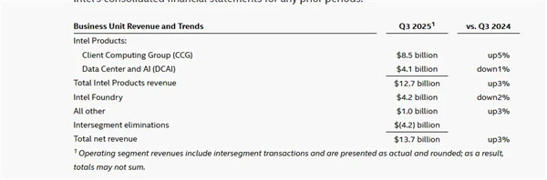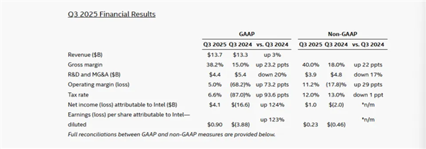 10月24日消息,Intel发布了2025年第三季度财报,第三季度营收为137亿美元,同比增长3%,归属于Intel的净利润为41亿美元,而去年同期为净亏损166亿美元。