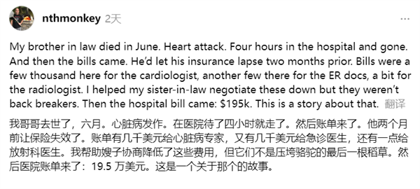 这位网名为Nthmonkey的用户透露,其亲属在心脏病发作后,在重症监护室接受了最后四小时的治疗,但医院开出的账单竟高达195000美元。导致费用如此之高的主要原因是,病人的医疗保险在事发前两个月已经失效。