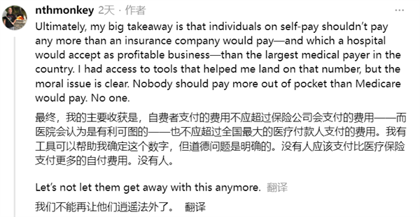 “医院自己制定规则、价格,认为可以从缺乏经验的人那里随意捞钱,”Nthmonkey 总结道,“没有人应该支付比 Medicare(医疗保险)愿意支付的更多的钱。我们不能再让他们逍遥法外了。”