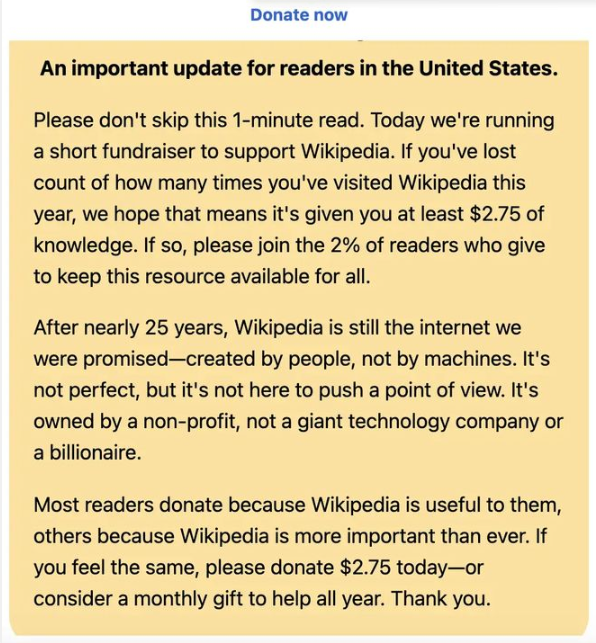 维基百科指出:“经过近25年,维基百科依然是人们承诺的互联网——由人类创造,而非机器。这里虽不完美,但从不试图推动某种观点。它属于非营利组织,而非大型科技公司或亿万富翁。”