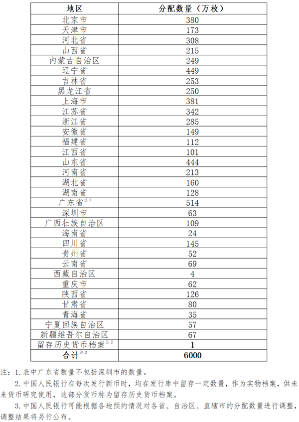 其面额为5元,直径为30毫米,材质为黄铜合金,发行数量为6000万枚。各省、自治区、直辖市分配数量如下: