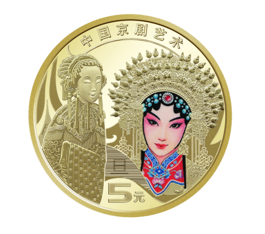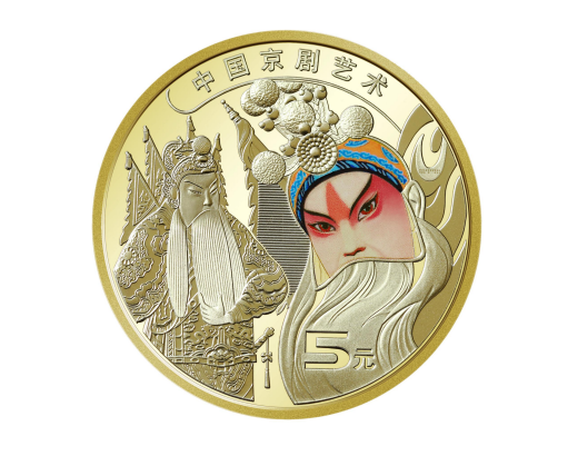 纪念币局部为彩色图案,辅以装饰化图形,并刊“中国京剧艺术”及面额“5元”字样。