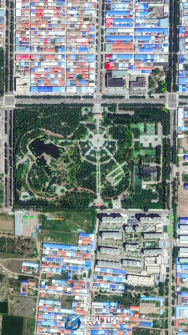 围绕木塔,卫星图清晰展示了应县古城的传统格局。
