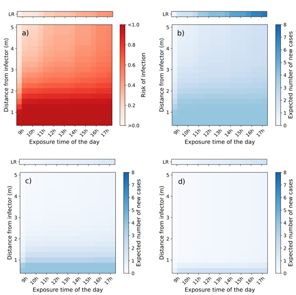 参考资料[2]:二次感染风险分布热图,a、b为未干预条件下的风险,c为所有学生佩戴FFP2口罩后,d为感染者佩戴外科口罩。