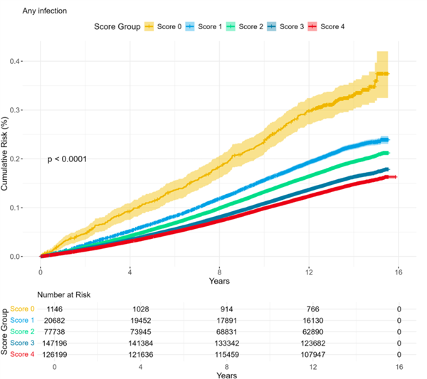 参考资料[5]:按健康睡眠评分分层的任何感染的住院累积风险(得分越高睡眠越好)