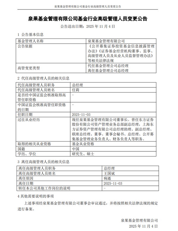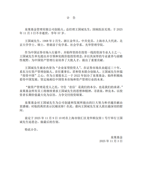 11月3日消息,今日,泉果基金发布讣告,泉果基金管理有限公司创始人、总经理王国斌,因病医治无效,于2025年11月3日去世,年仅57岁。