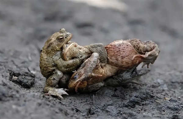 由于雄性蟾蜍太“疯狂”,有的蟾蜍中雌性是没有选择权的,往往还没有准备好,雄蟾蜍就扑上来了,有时候还不止一个,多只雄性蟾蜍缠绕雌性形成一个“球”,这有可能导致雌性蟾蜍意外死亡。