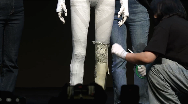 当工作人员使用剪刀打开了这款机器人的外衣、肌肉,裸露到视野里的则是金属、液压管等,根本不是网传的真人,彻底打破了网络谣言!