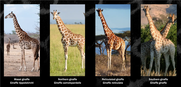 这四个物种的分类,是根据长颈鹿的头骨大小、头的形状、斑点形状、生活环境、基因差异等多方面综合判定的。