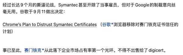 赛门铁克作为一个当时来说,可信度最高的 CA,已经是躺着赚钱了,却依旧存在滥发证书的情况。。。这次的事故,最终导致 2018 年谷歌彻底删除所有赛门铁克的根证书,后者也被迫把旗下的 CA 业务出售给了 DigiCert。