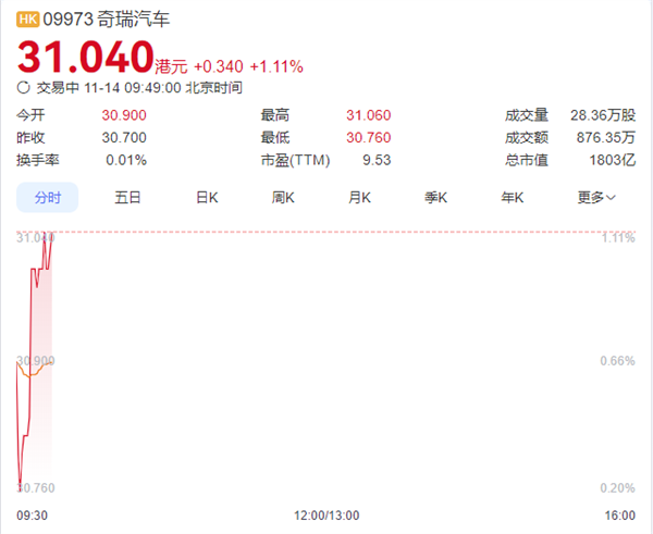 11月14日消息,11月13日,奇瑞汽车开盘小幅上涨后,随即快速回落,盘中一度跌至30.42港元,跌幅扩大超3%,收盘前虽然小幅回落,最终仍下跌2.17%,报收30.7港元。