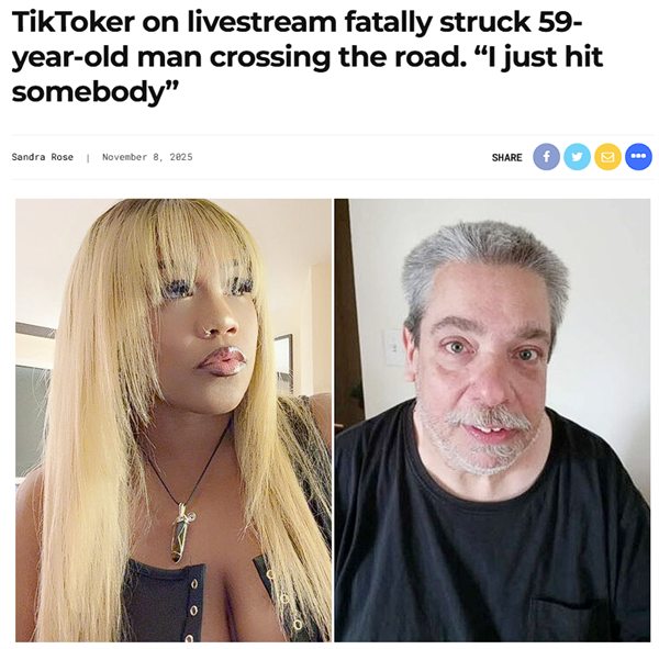 43岁TikTok网红 "Tea Tyme"(本名妮莎・特内莎) 在开车直播时,撞上并导致59岁行人达伦·卢卡斯死亡。
