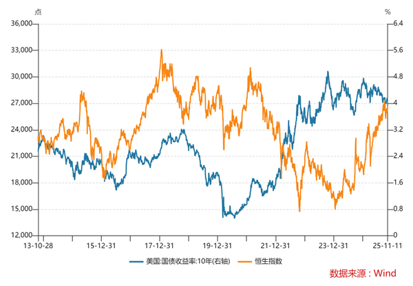 先看全球流动性。港股走势往往与美国10年期国债收益率呈反向关系。
