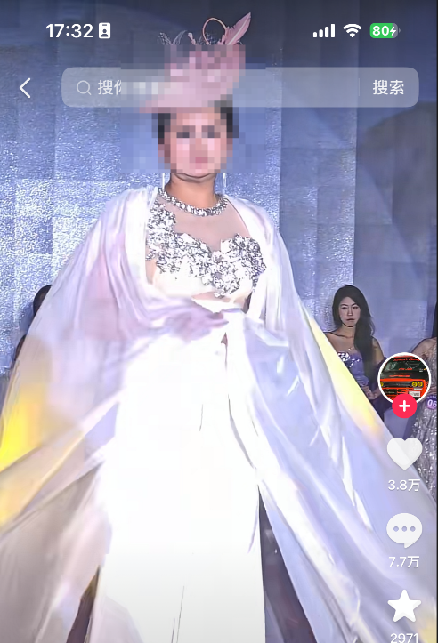 相关视频显示,这位夺冠的15号女选手是一位看起来年龄偏大的女士,头戴桂冠、身披冠军绶带、手拿冠军证书,在强光下独自走上T台,向观众与评委致谢。