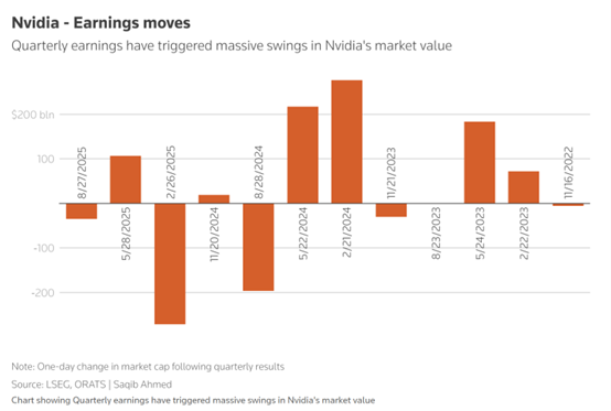 一项分析发现,以英伟达目前约4.6万亿美元的市值计算,这一期权隐含的市值变动(3200亿美元)将创下这家AI领头羊史上最大的季报后单日市值变动。