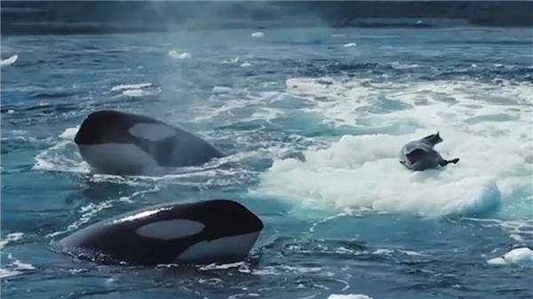首先,它们会先确定海豹的位置,在水里它们是能感知到的,若海豹是在浮冰或者其他物体之上时,虎鲸则会把身体直立,脑袋探出水面来确定目标。