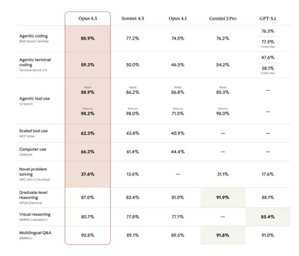 在专业性能测试中,Opus 4.5的编程能力尤为突出。基于国际通用的AI编程评估基准SWE-bench,该模型的得分超过谷歌近期发布的Gemini 3 Pro及OpenAI的GPT-5.1,成为当前“代理式编程”领域的新标杆。