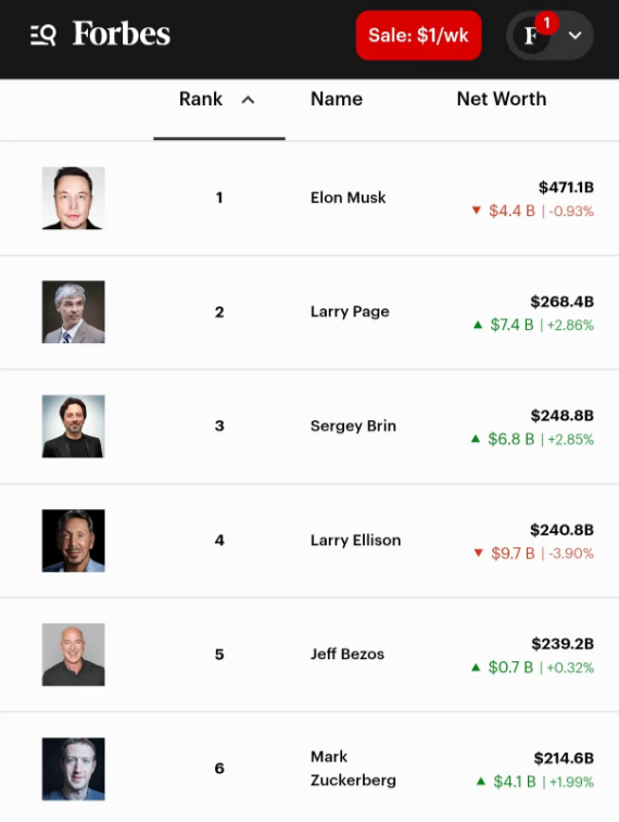 最新的福布斯富豪实时排行榜上,拉里·佩奇和谢尔盖·布林的个人财富分别达2684亿美元、2488亿美元,分别成为世界第二、第三富豪。