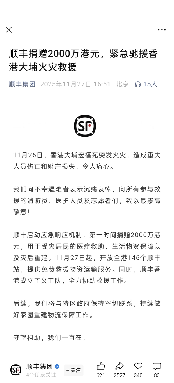 11月27日消息,顺丰集团通过官方公众号发布消息,顺丰捐赠2000万港元,紧急驰援香港大埔火灾救援。