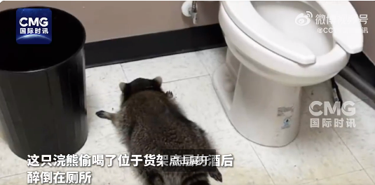一只浣熊在打烊时间后闯入酒铺,偷喝了货架底层的酒,还打碎了很多酒瓶,最后昏倒在厕所。