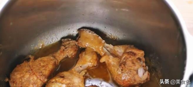 3、准备一个高压锅,里面加入25克油,油热后放入鸡腿,小火煎至微黄后再翻面,然后再将另一面煎至微黄后,加入250ml的水,然后用锅铲稍微松动一下鸡腿儿,防止糊锅。