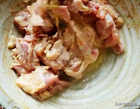 4、腌好的肉,里面再加入一个蛋清,用筷子顺着一个方向搅拌均匀。准备适量红薯淀粉,把腌制好的鸡块表面都裹上干的红薯淀粉(不需要加水)。