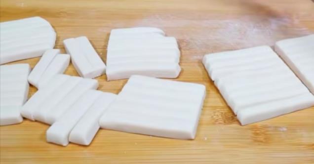 3、将面团放到撒有干糯米粉的案板上,用擀面杖将面团擀成5mm后的面片,切成大拇指长的小段,这样我们的江米条生坯就做好了。