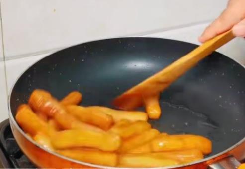4、起锅烧油,加入凉油(油的用量看锅大小),直接加入我们提前做好的生坯,中小火炸,炸至所有的江米条都浮起来,然后用筷子不断地把江米条翻动(江米条受热均匀),炸至表面金黄后捞出控油。