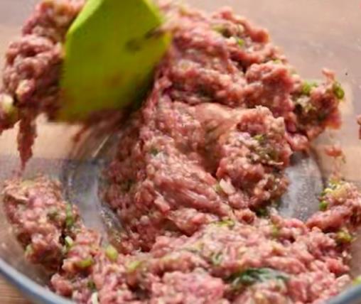 3、准备一个碗,里面加入350克的牛肉碎(鸡肉或鸡肉),30克葱,15克的姜,再加入一个鸡蛋,1克五香粉,1克白胡椒粉,1克花椒粉,8克盐,30克生抽,125ml温水,用筷子拌匀以后朝着一个方向搅拌,搅拌到拉丝的状态就可以了。起锅加水,大火煮至水沸腾后,加入100克的粉条,煮是变软后,捞出放到案板上切碎备用,再准备250克芹菜切碎,将切碎的粉条和芹菜加入我们之前拌好的肉馅中,用筷子顺着一个方向搅拌均匀。