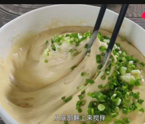 3、十分钟后再来搅拌,顺时针快速的搅拌(3分钟左右),再盖上盖子或保鲜膜,发酵至两倍大,室内温度29°,发酵50分钟,也可以晚上做好,用保鲜膜覆盖放到冰箱冷藏,隔夜发酵,早上取出来炸,发酵好的面团是原来的两倍大,表层有明显的气泡,在发酵好的面团里,加入适量的葱花,用筷子从底部翻上来搅拌,搅拌的过程中,你可以发现面团内部已经有发酵好的蜂窝状态,这一次搅拌不要顺着一个方向用力搅拌(避免面团上劲,保持蓬松感)。