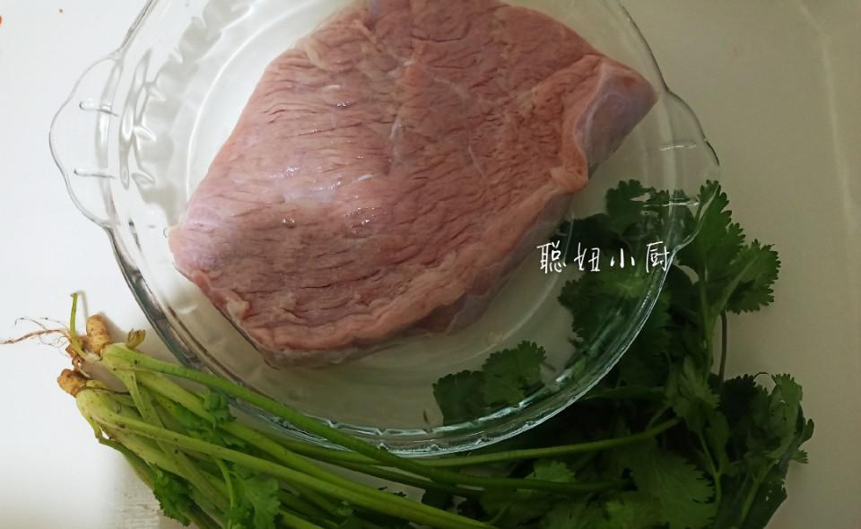 【配料】牛腱肉300克,盐4克,胡椒粉5克,蛋白1个,料酒少许,淀粉30克,香菜少许