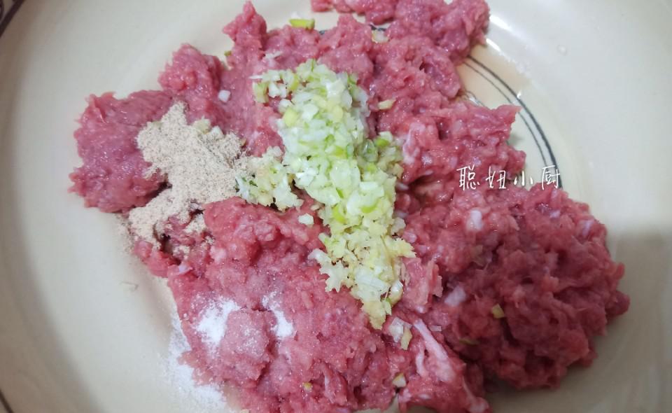 3、牛肉馅中加入一勺小苏打,加入葱姜、盐、胡椒粉、料酒。用手顺时针搅拌。必须是顺时针方向。用手搅不动时,拿起肉馅,搅打至粘稠状。