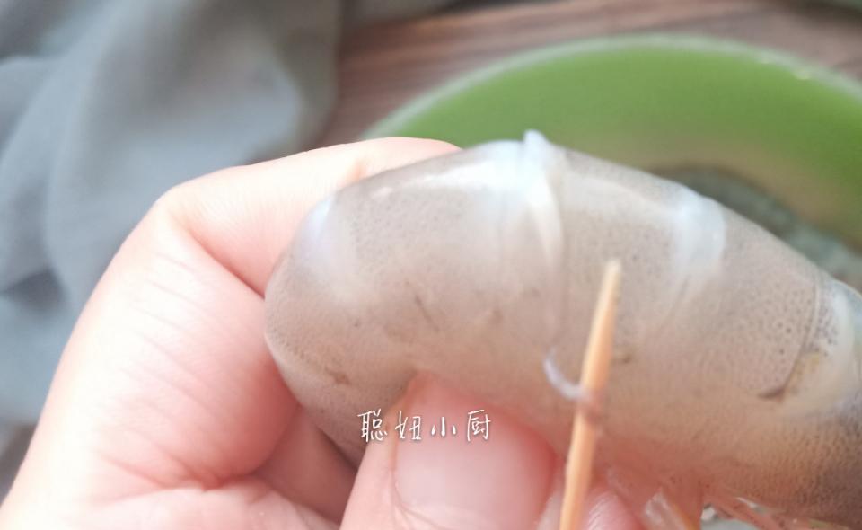 2、去除虾线,从虾头数到虾的第三节。将虾身对折,用牙签轻轻挑出。虾线就会出来。