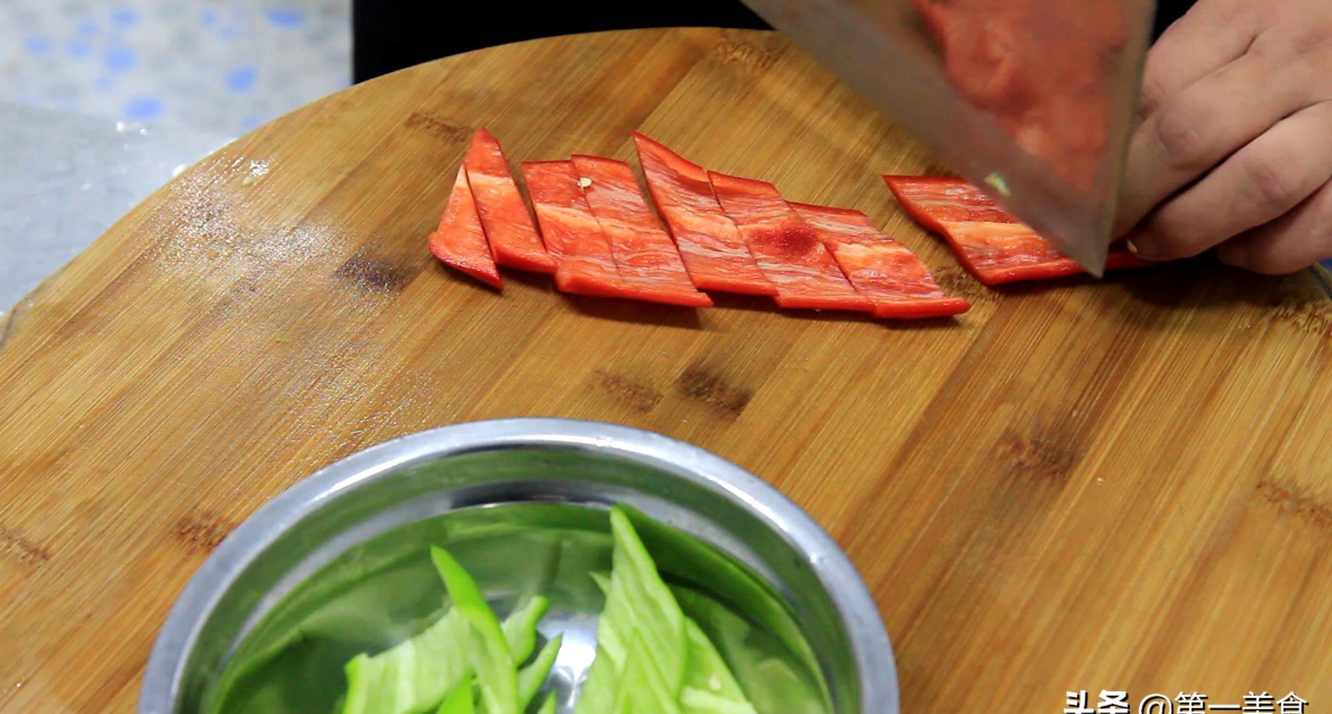 青椒两片,红椒一片,均切成菱形片。青红辣椒颜色相配,更好看。