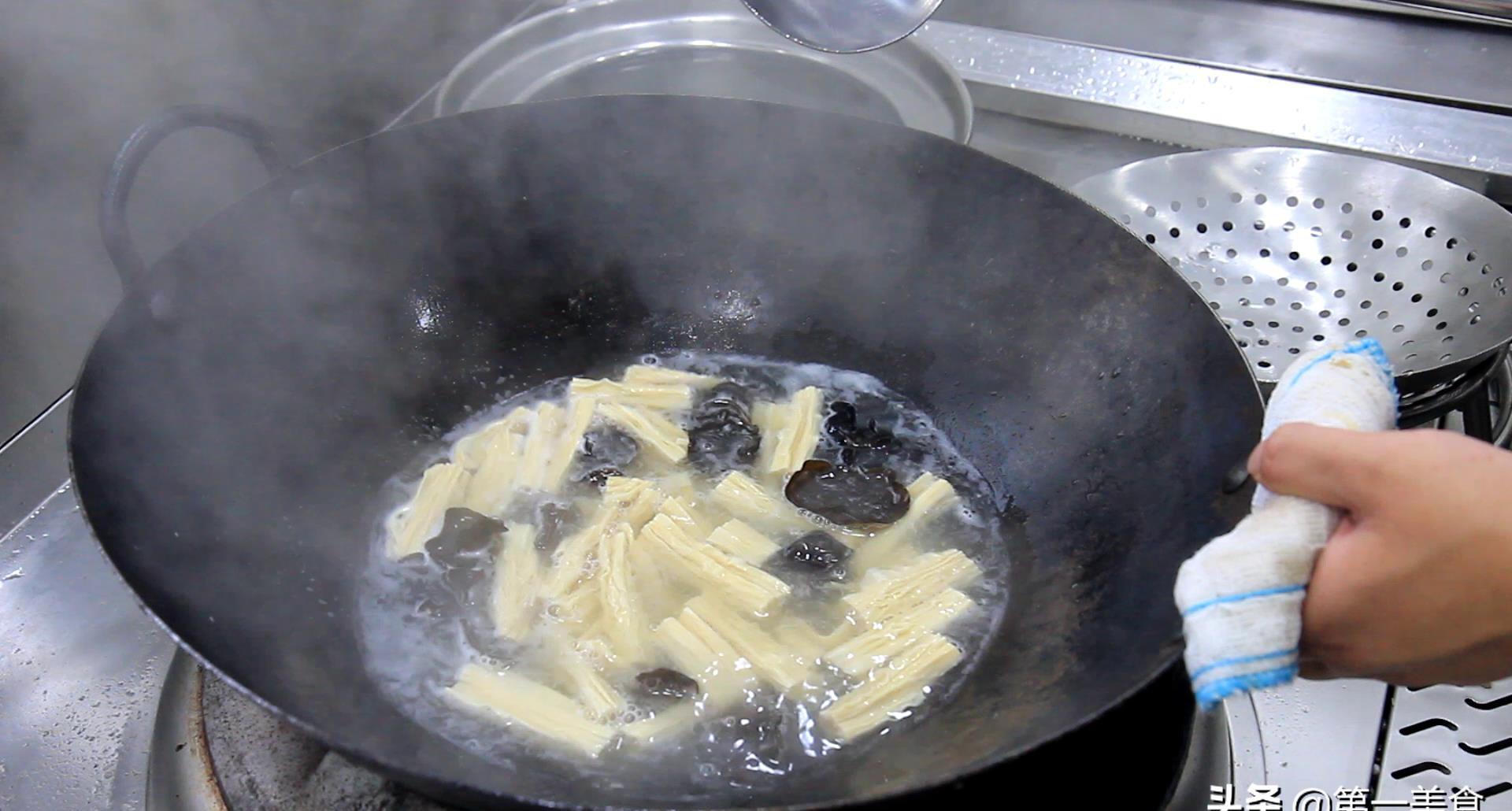 接下来我们将腐竹和木耳焯水:锅中烧开水,将腐竹放入温水中,倒入4克料酒,倒入料酒可以减少腐竹的豆腥味,等到水接近煮沸后,加入木耳,水烧开后,立即倒掉控水。