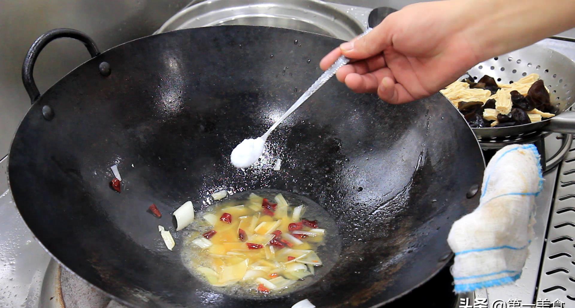 接下来我们开始做饭:锅里烧热油,加入葱、姜、蒜、抓2克干辣椒一起炒。