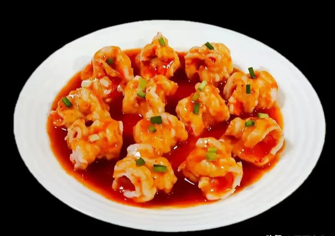 番茄酱虾球,这道菜是将虾切成片,卷成球状,淋上番茄酱而成。酸甜可口,象征着新年快乐。