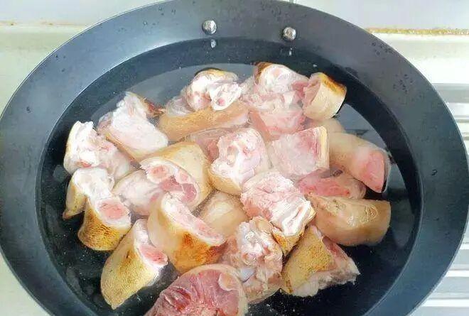 然后,准备一锅水,加入适当数量的生姜片,绿色的洋葱和烹饪酒,将猪肉肘放入锅中,煮沸高热量并将其取出,然后洗掉血液。此步骤旨在消除猪肉肘的腥味,并为其增添些许香气。
