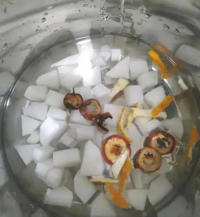 白色萝卜,chenpi,无花果加入水,用岩糖将汤煮沸约30分钟。