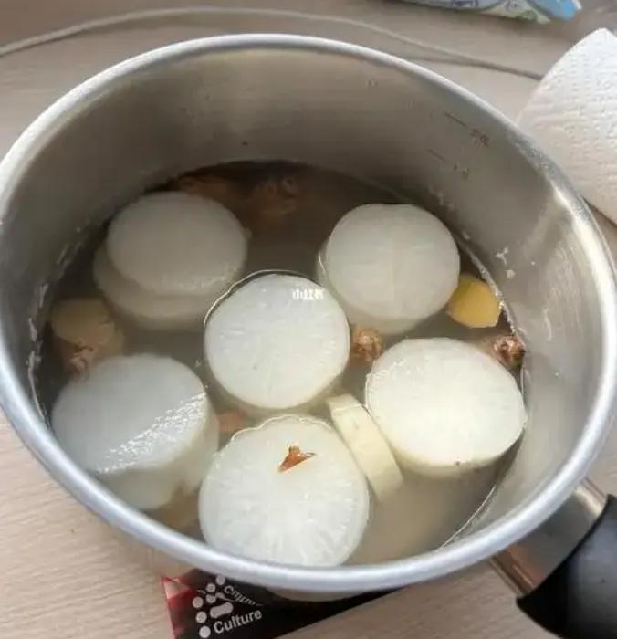 白萝卜,霍桑干,岩石糖加水和煮汤约30分钟