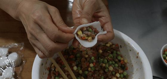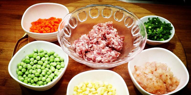 [主要成分] 200克虾/猪肉填充200克/玉米粒100克/豌豆100克/绿洋葱50克/胡萝卜切成50克