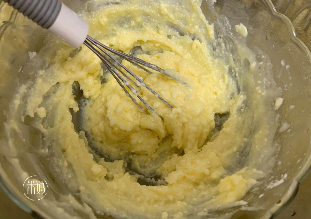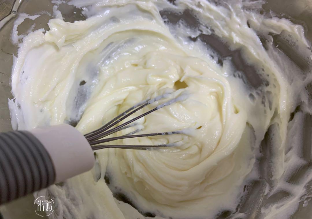 2。加入奶酪,加上细砂糖隔热水,融化,筛选在玉米淀粉中,混合良好。