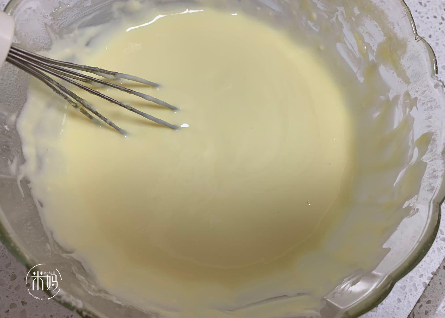 5。白巧克力在水中融化,并用手动蛋黄搅拌。