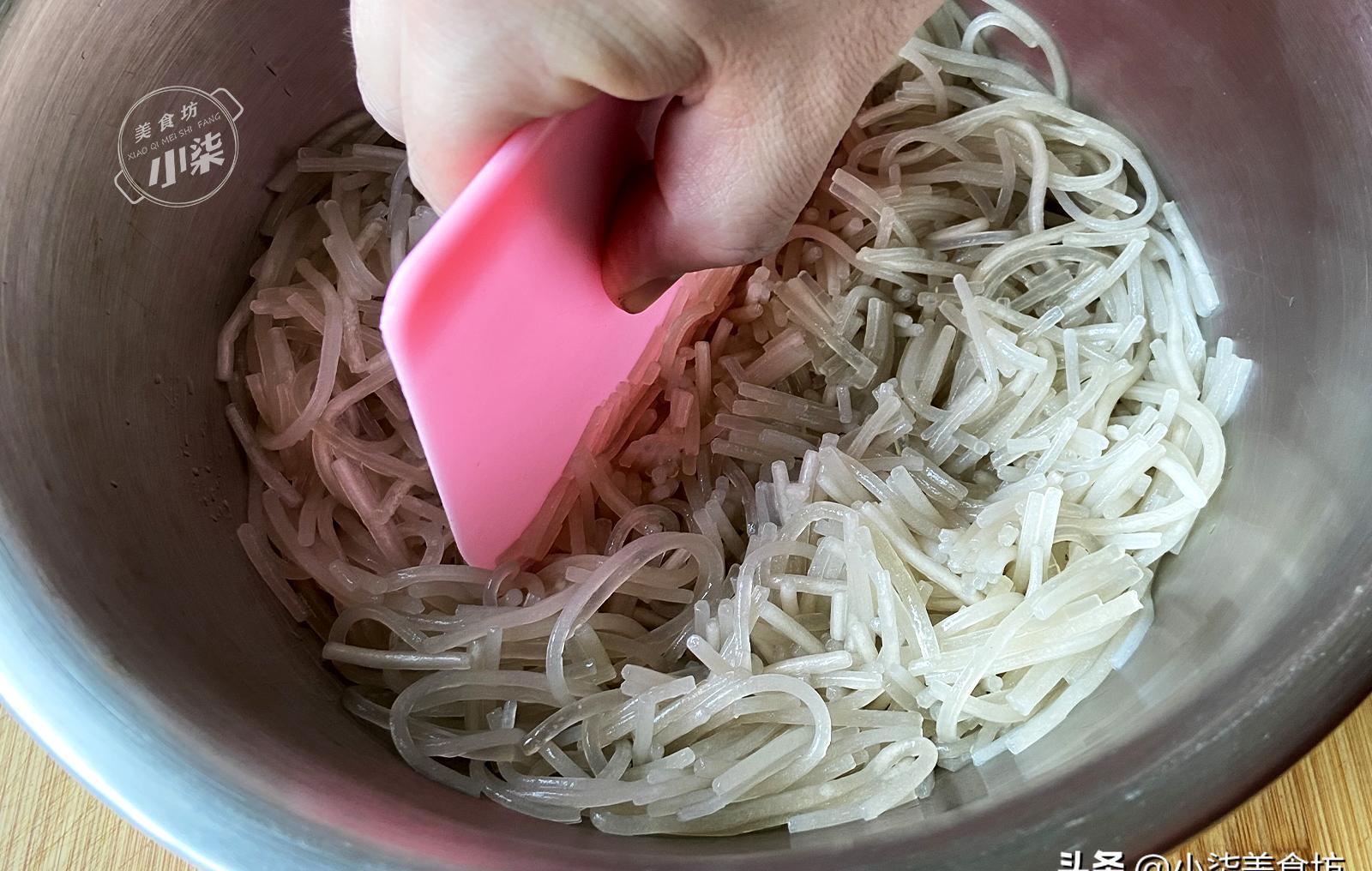 2。浸泡的面条用冷水冲洗并去除干水,将其放入盆中,用刮刀将其切成碎片或将刀切成破碎,不要切太多,将棒放入锅中,而不是到处都很容易运行。本质