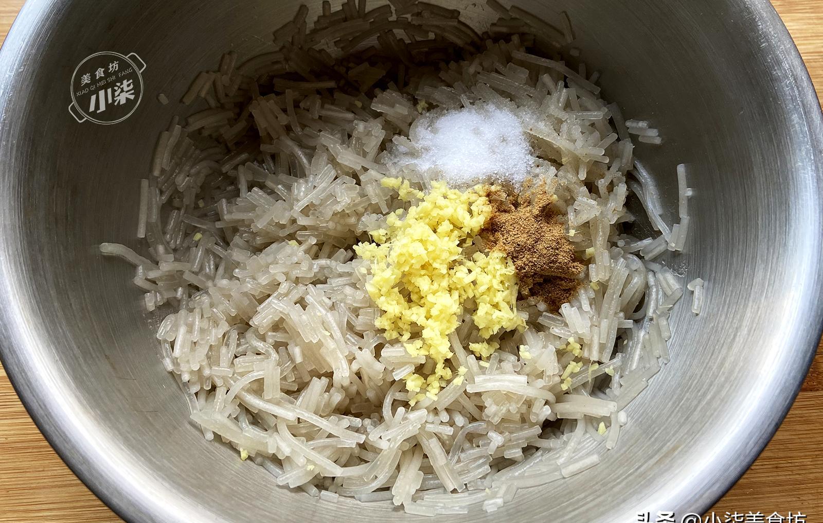 3。将生姜切成碎的末端,并加入一汤匙的13岁。那些喜欢吃胡椒的人也可以加入胡椒粉,并加入适当的盐。您不需要在这里放洋葱。筷子完全搅拌。