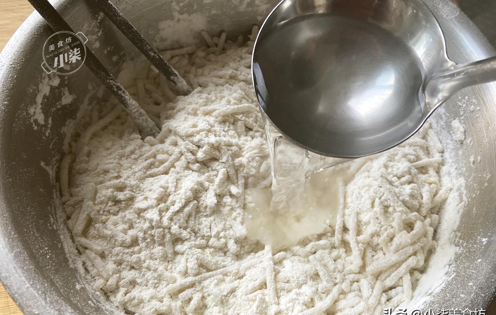 6。将沸水铲入面粉中,并在烫伤时搅拌。由于水中的空气,其目的是从热开水中干燥。它会溅出油,然后用沸水煮沸。味道更柔和。